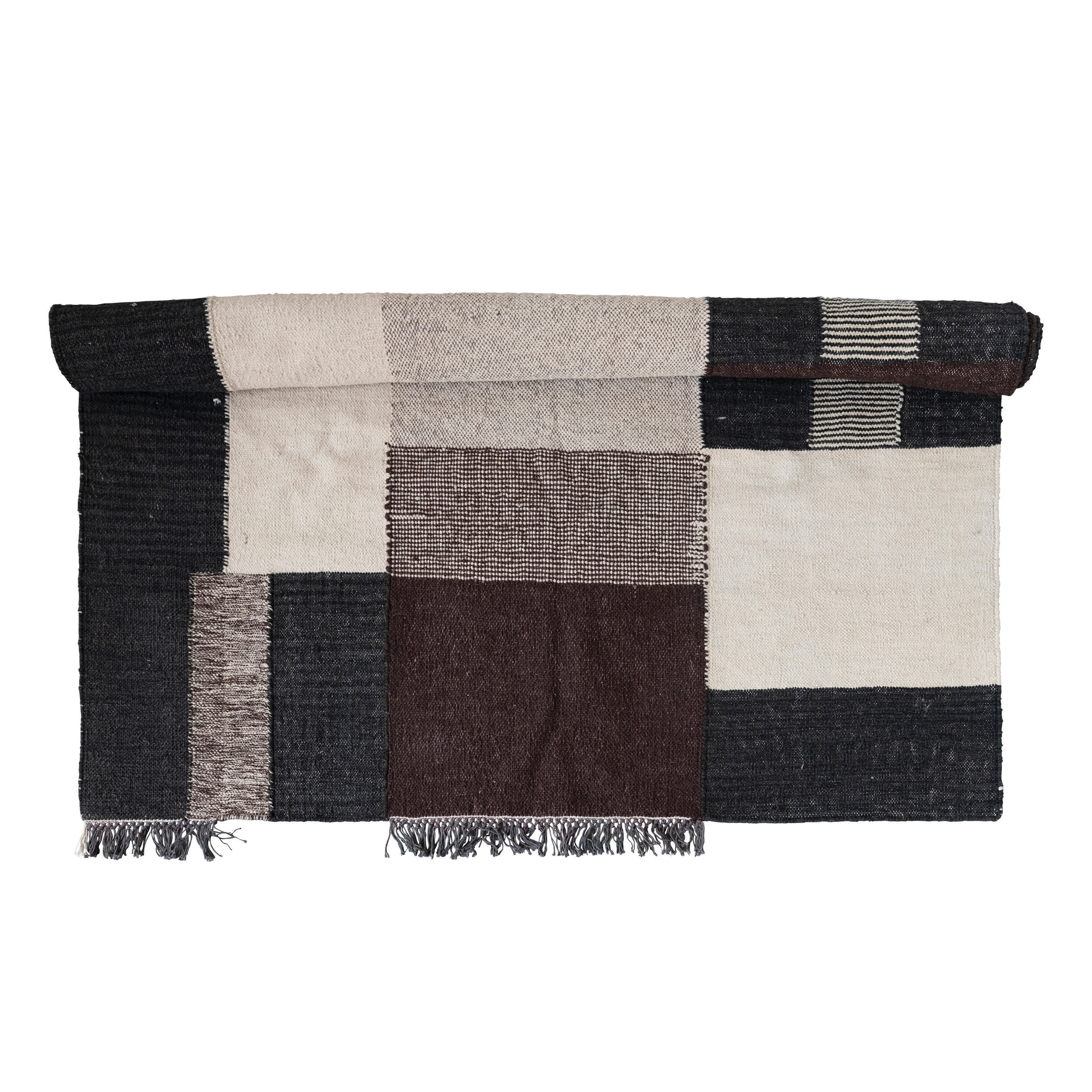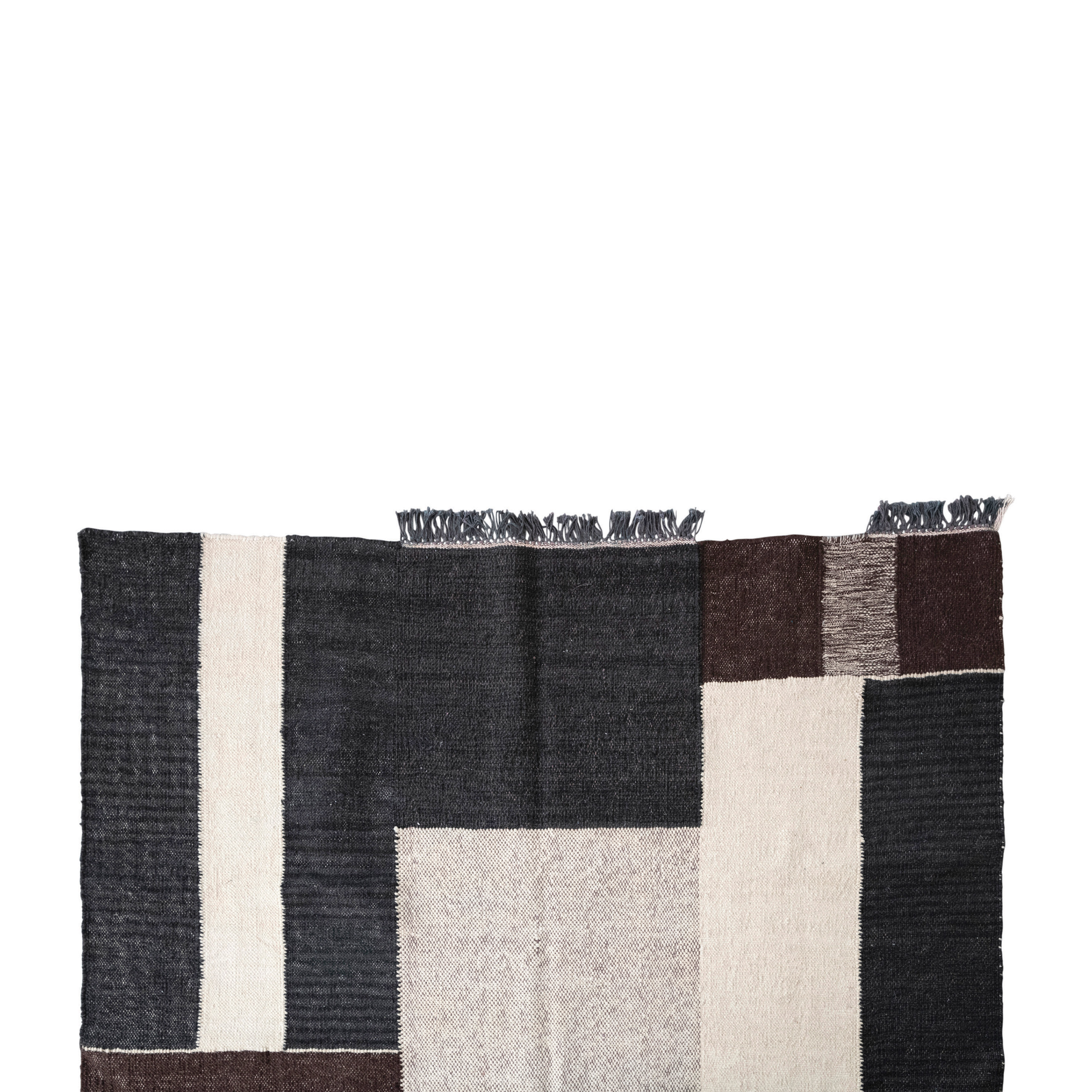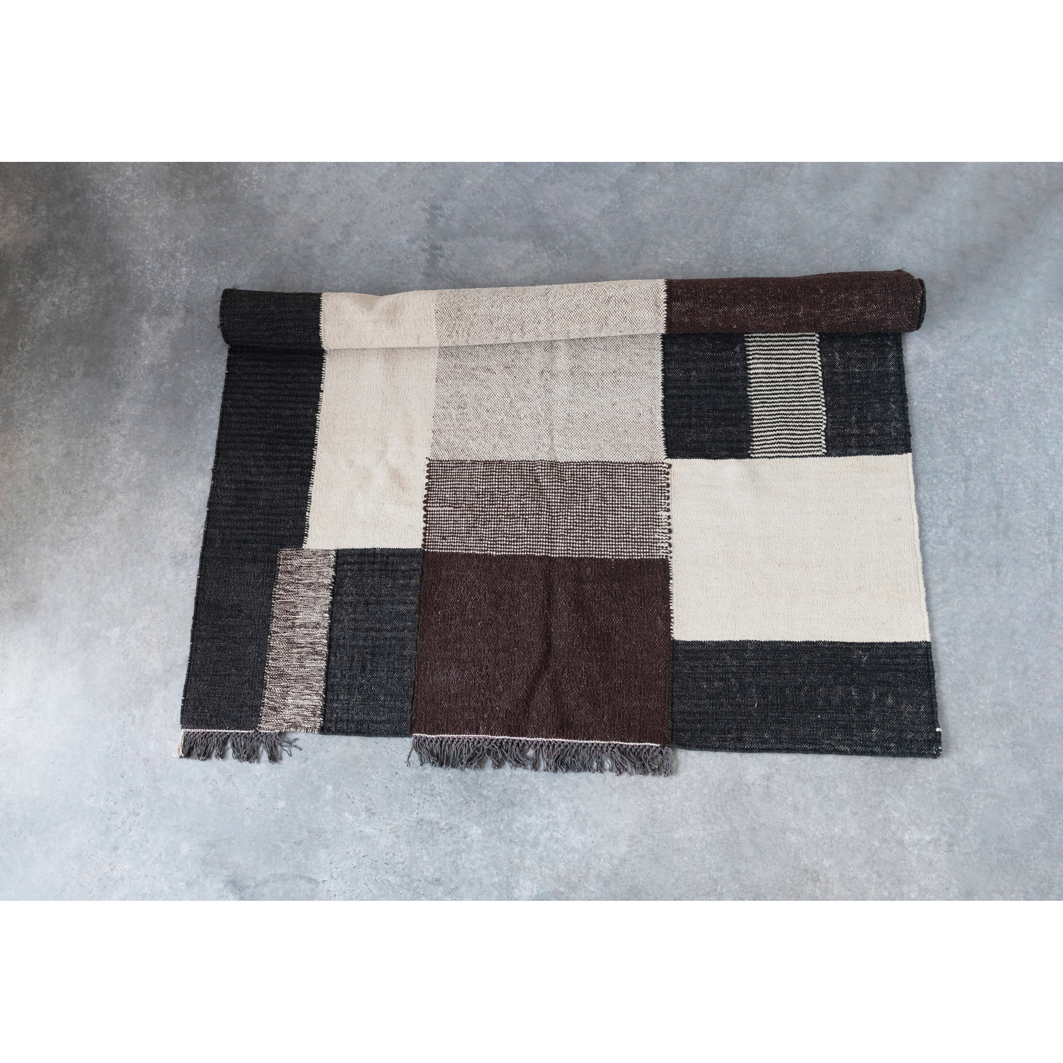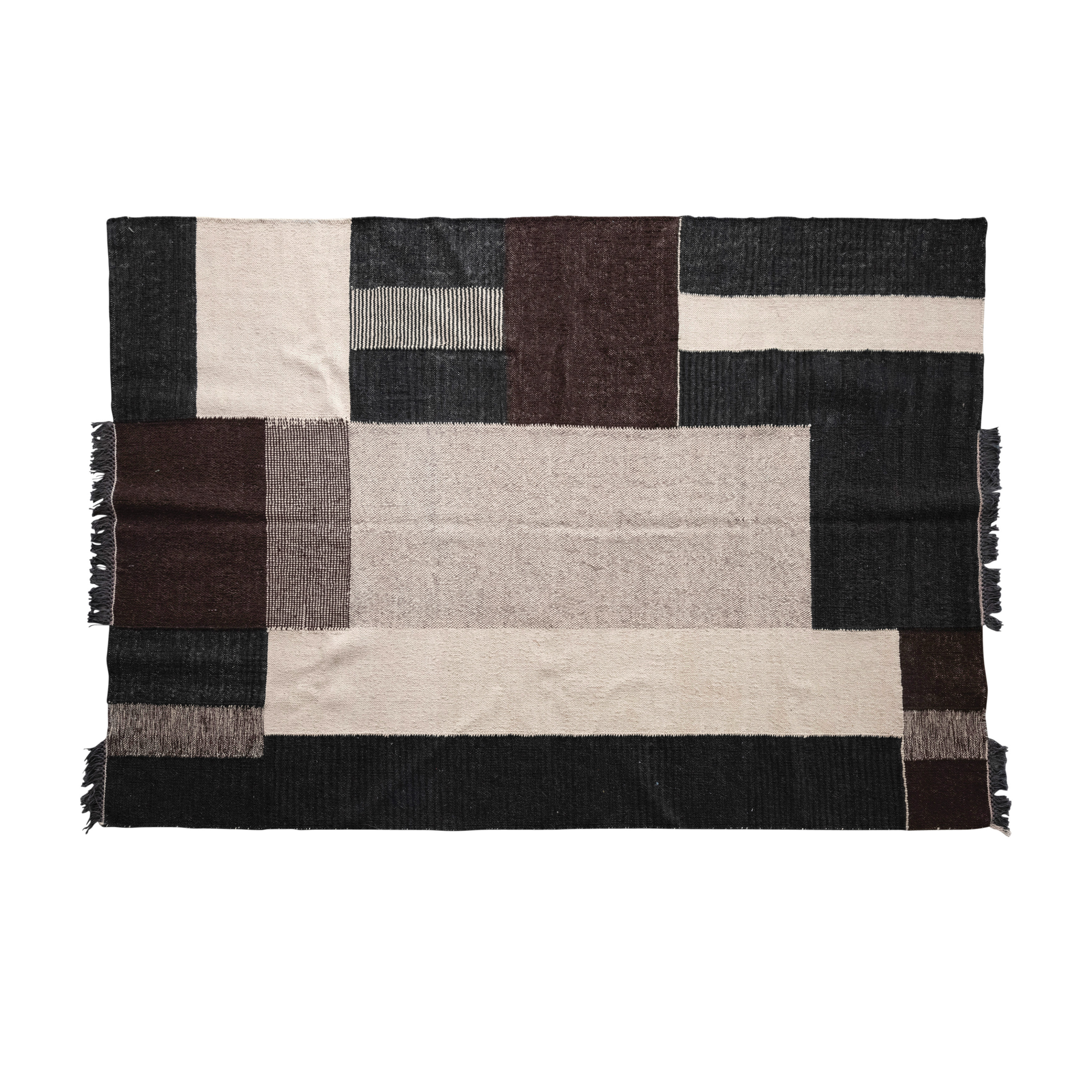 This strikingly modern area rug features soft woven cotton with a bold geometric design, finished with decorative fringe. Black, brown, and white woven cotton rug with geometric design and fringe. Dry clean only. Made from wool and cotton.