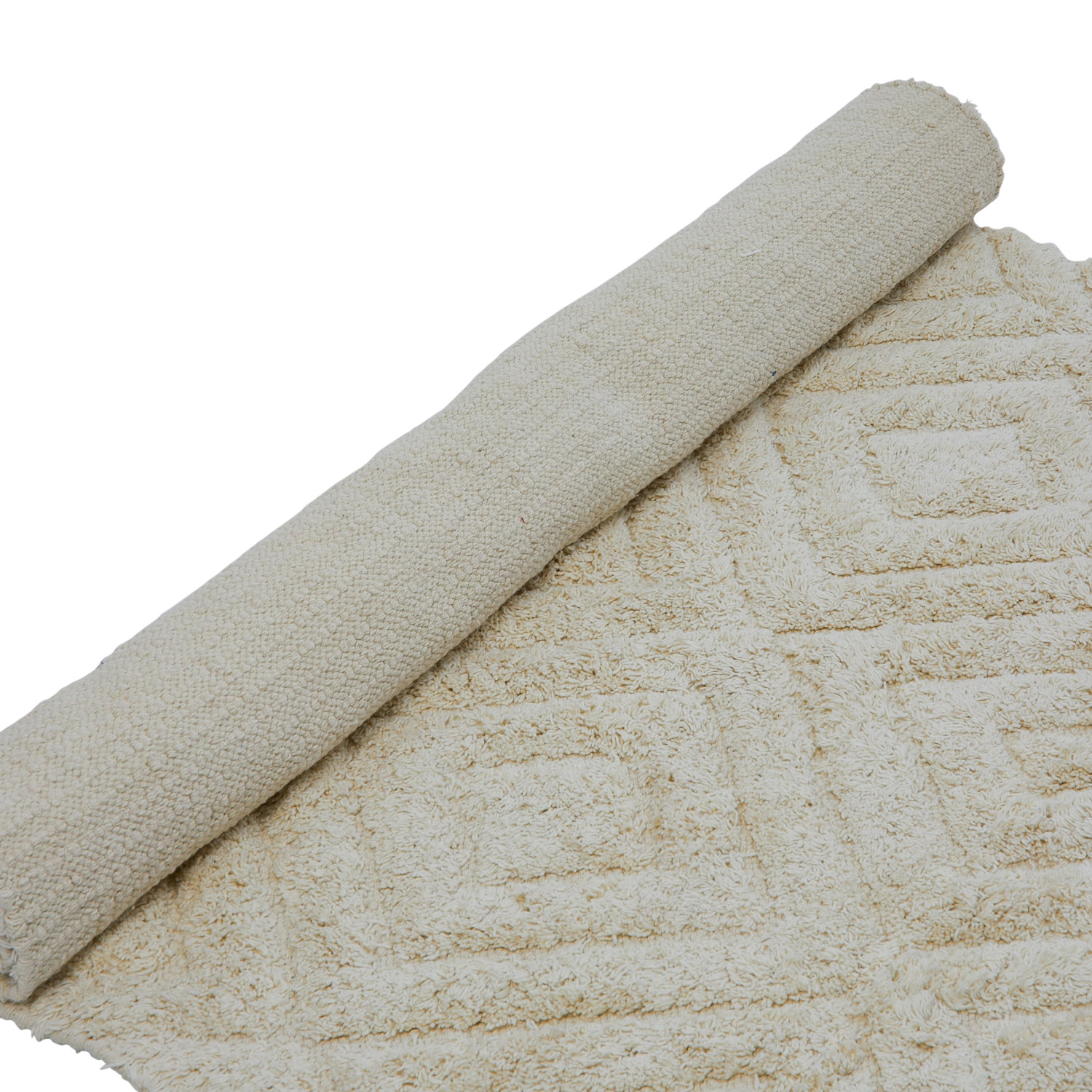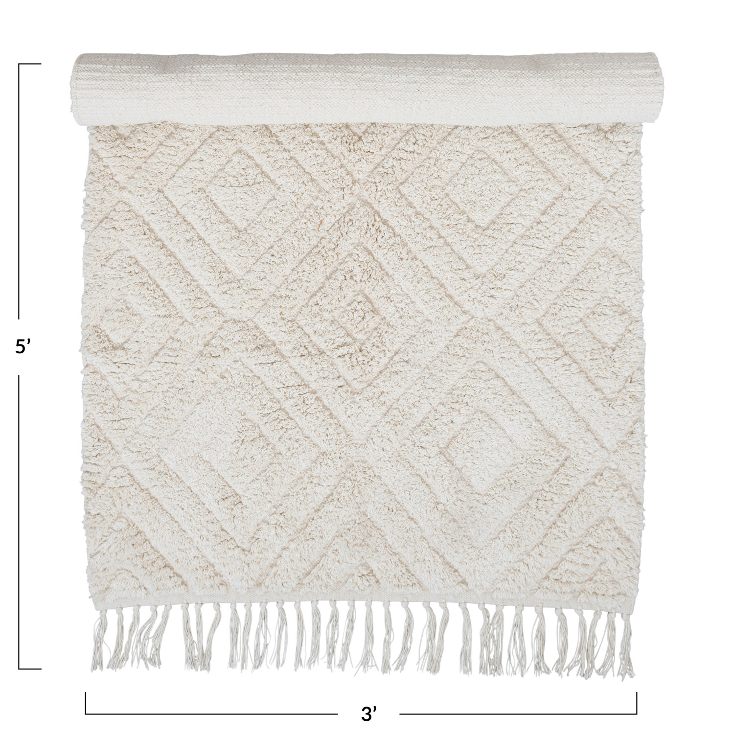 This cozy throw rug features a tufted diamond pattern on supple cotton with decorative fringe. Cream cotton tufted rug with diamond pattern and fringe. Spot Clean Only. 97% Cotton, 3% Other Fibers.