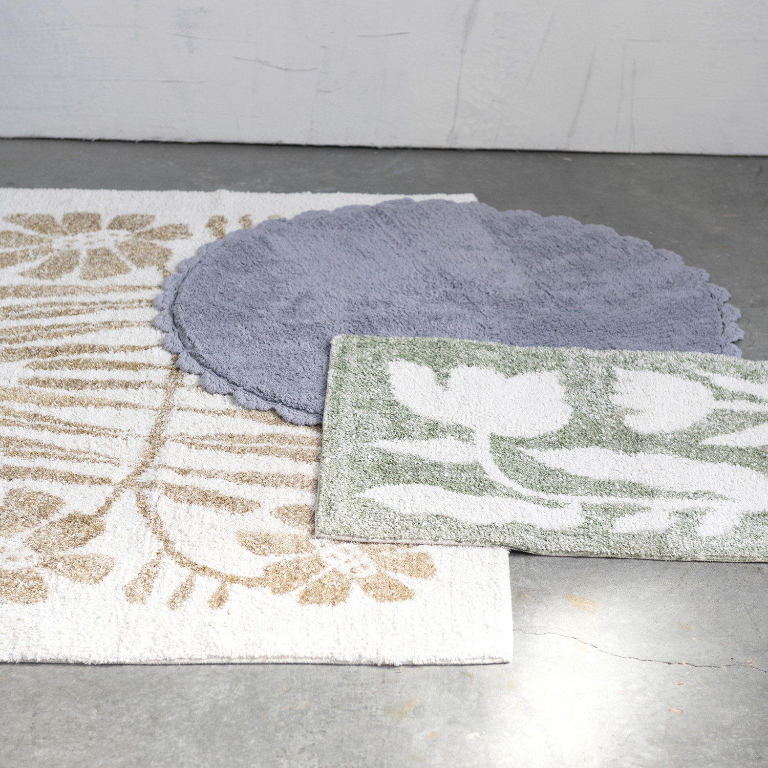 This elegant rug showcases supple tufted cotton finished with an intricately crocheted and scalloped trim.