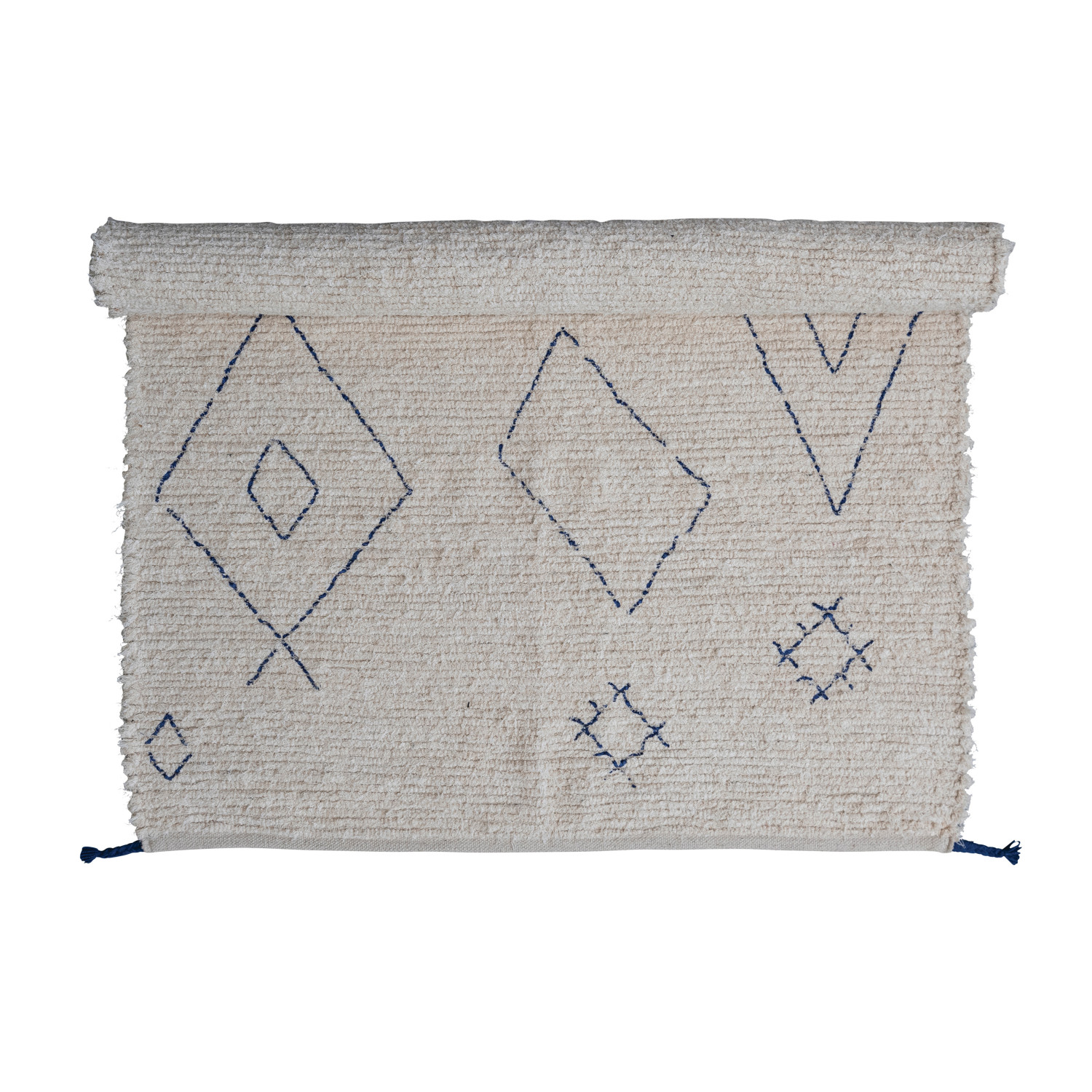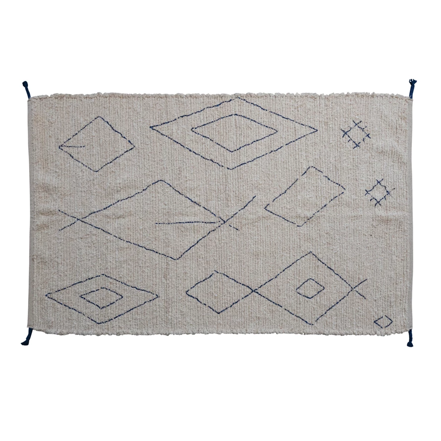 Cotton Tufted Rug w/ Moroccan Design & Braided Tassels, Natural & Blue