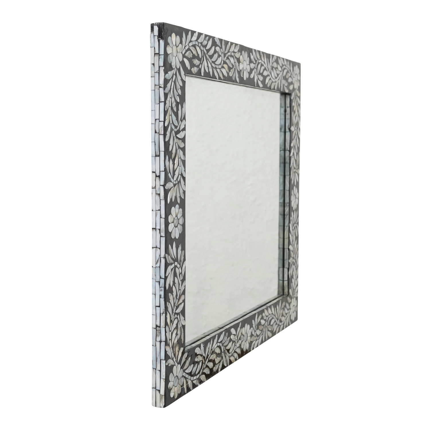 Catalog Name: 30-1/4"W x 26-1/4"H MDF Framed Wall Mirror w/ Inlaid Mother of Pearl Flowers & Leaves, Black & White (Hangs Vertically & Horizontally)