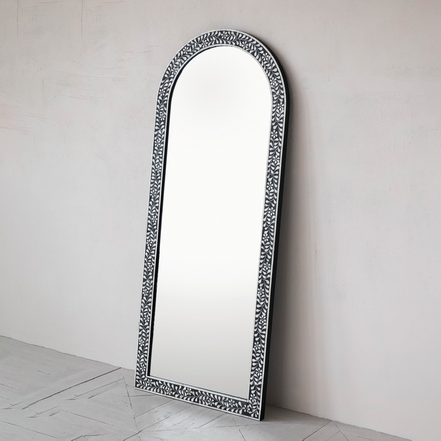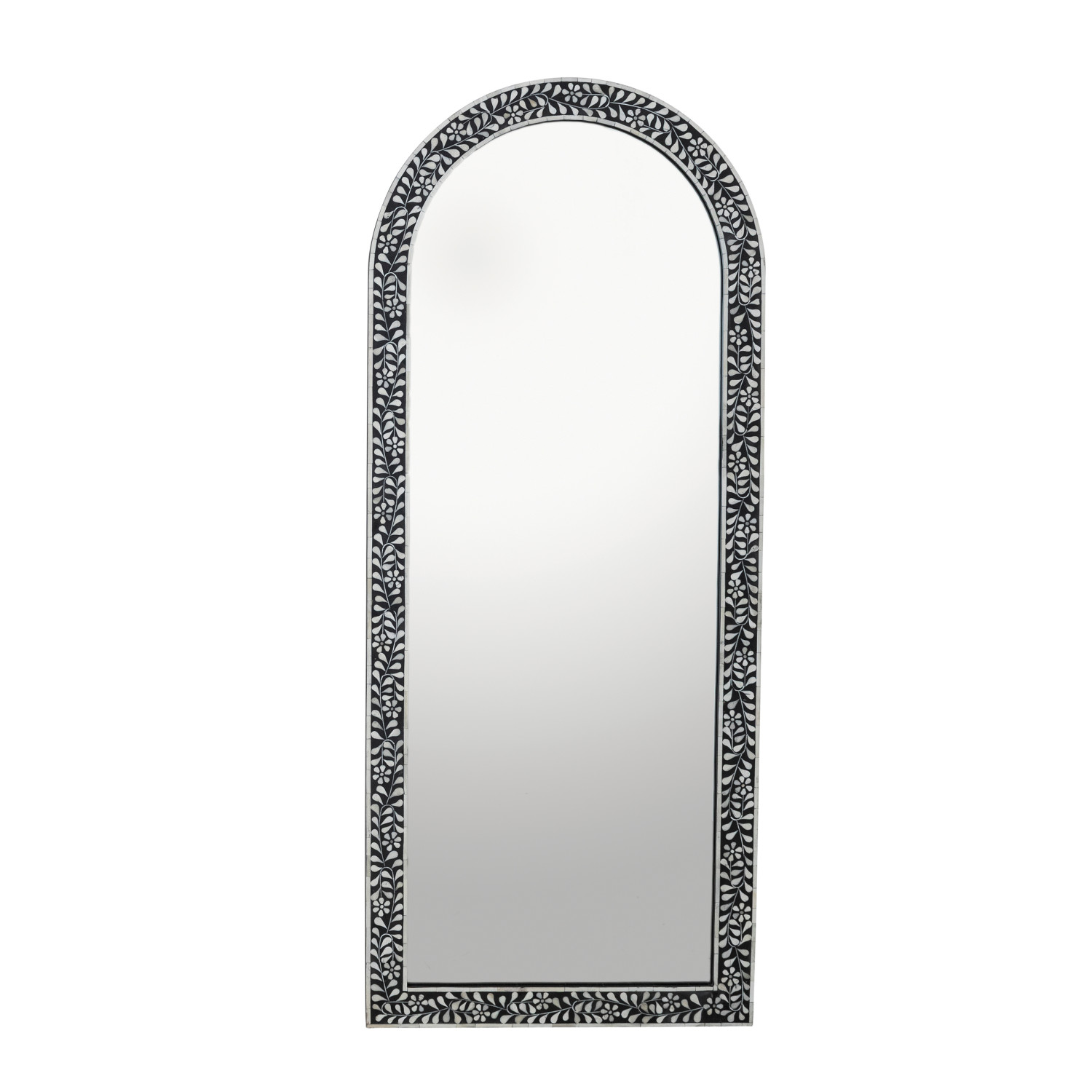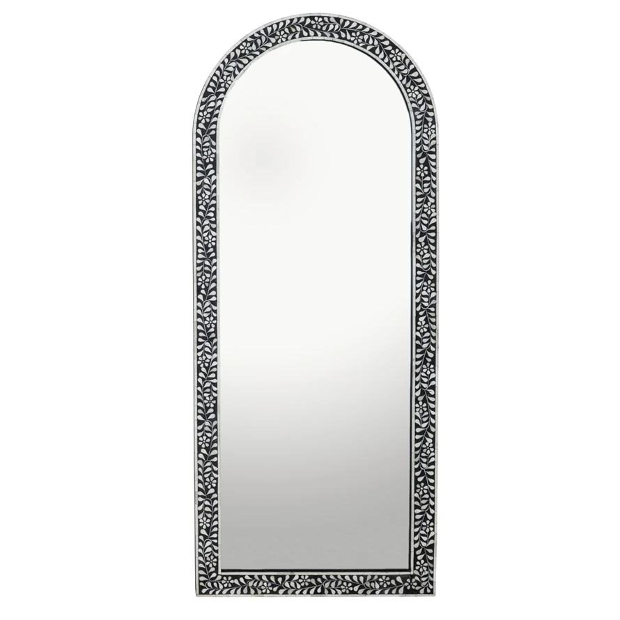 Catalog Name: 28"W x 68"H Mango Wood & MDF Arched Mirror w/ Bone Inlay Flowers & Leaves, Black & Ivory Color, Truck Ship (Hangs or Sits)