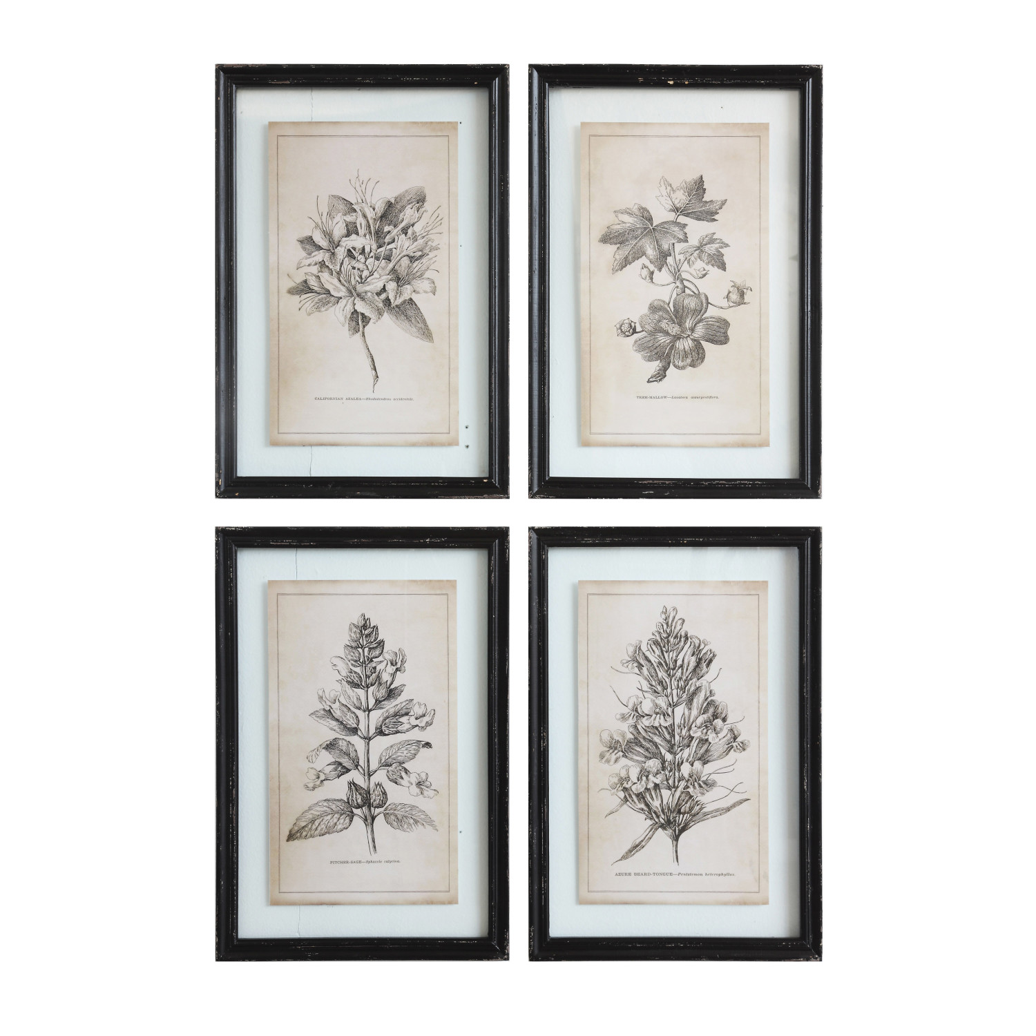 This set of wall decor each features a different floral image. They are each in a distressed black frame. Hang them together in a grouping or in different locations around your room to help tie the space together.
