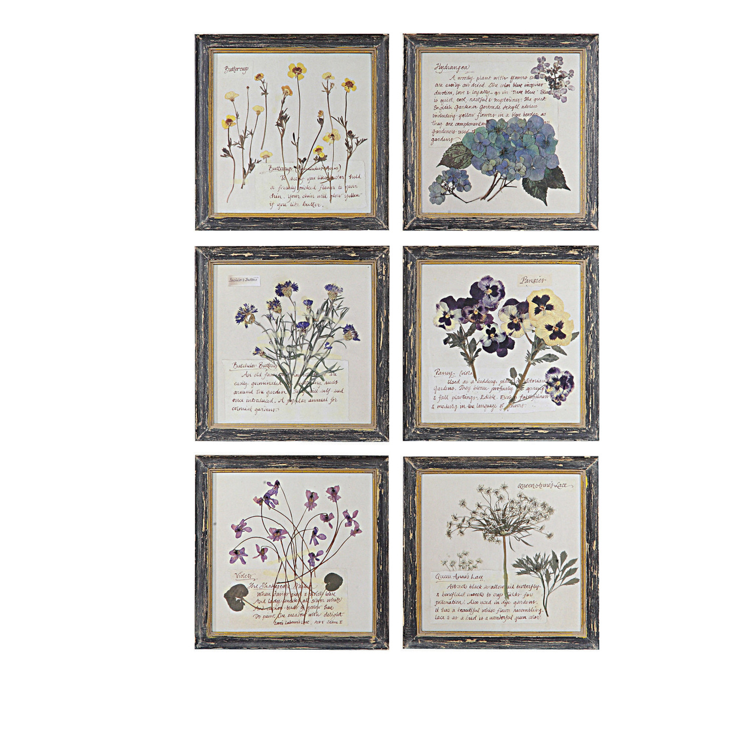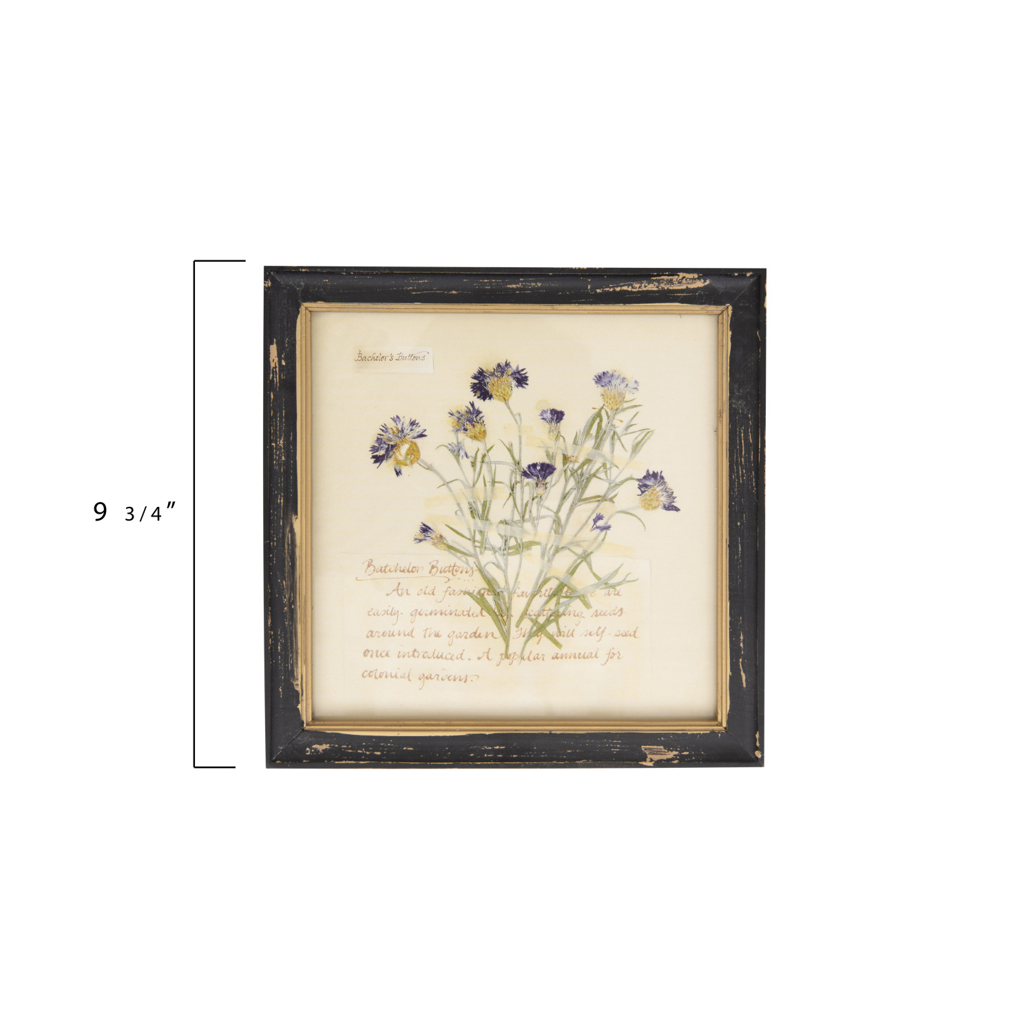 Each of these framed flower prints has an old wives tale or practical information about the featured botanical. The wood frames come in an extremely distressed black finish. Perfect hanging together in a grouping or in different locations around your store. Comes in 6 styles. Species of flowers featured: Buttercup, Bachelor's Button, Hydrangea, Pansies, Violet, Queen Anne's Lace.
