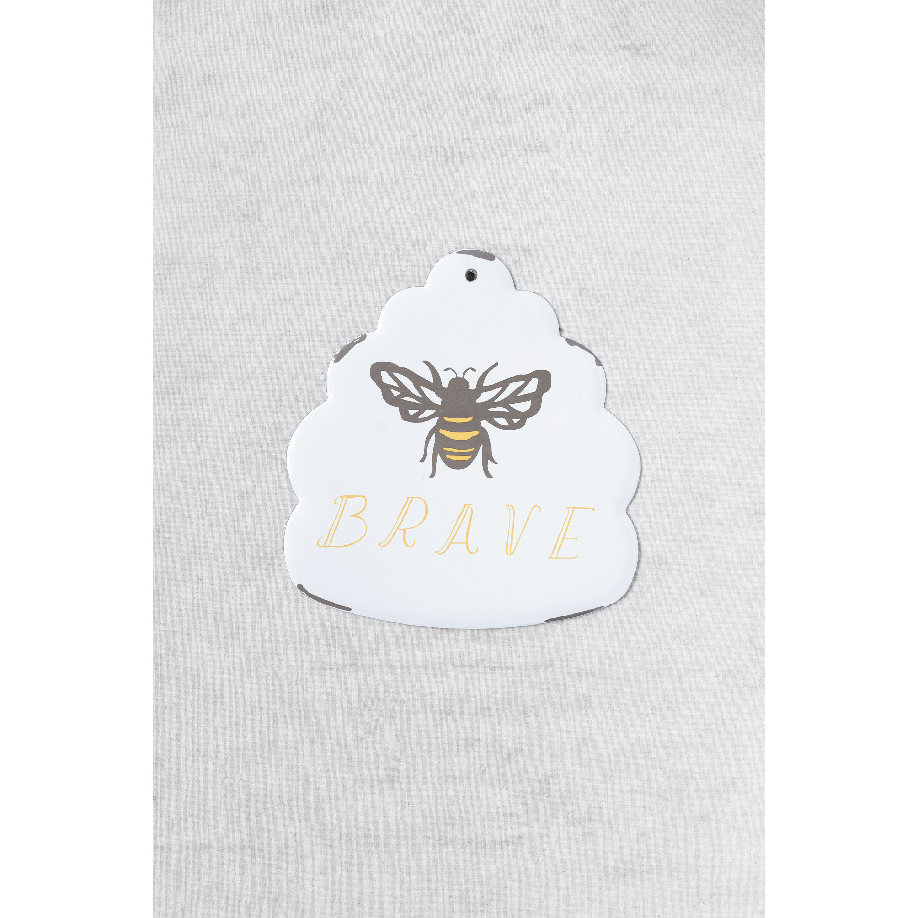This darling pieces of wall art showcases a metal beehive silhouette finished with a whimsical bee illustration and inspirational message. Distressed white enameled metal wall hanging beehive with black and yellow bee illustration and "brave" quote. Display this stunning wall decor to effortlessly enhance the design of any living space. Made from 100% glazed iron.