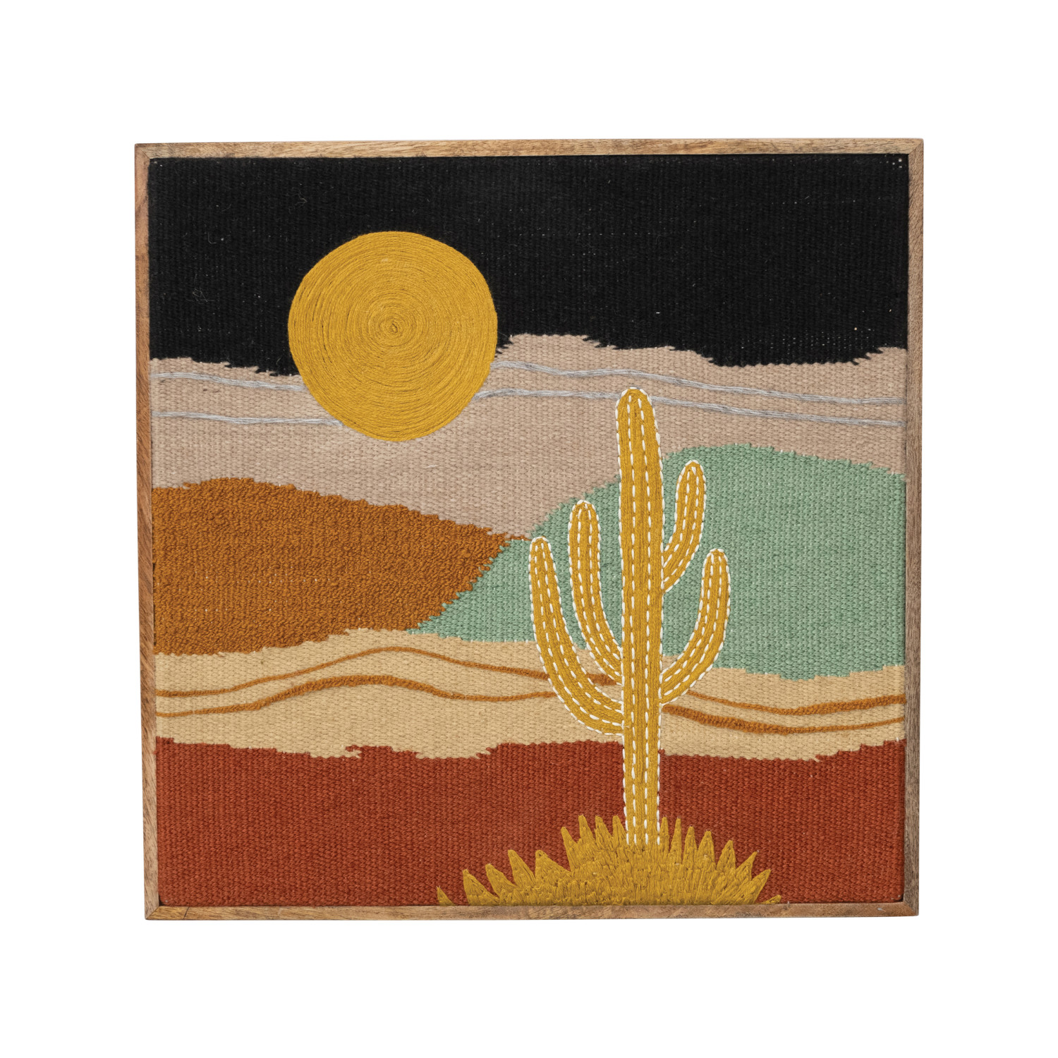 Catalog Name: 18-1/2" Square Wood Framed Woven Cotton Blend Embroidered Wall Décor w/ Desert Landscape, Multi Color