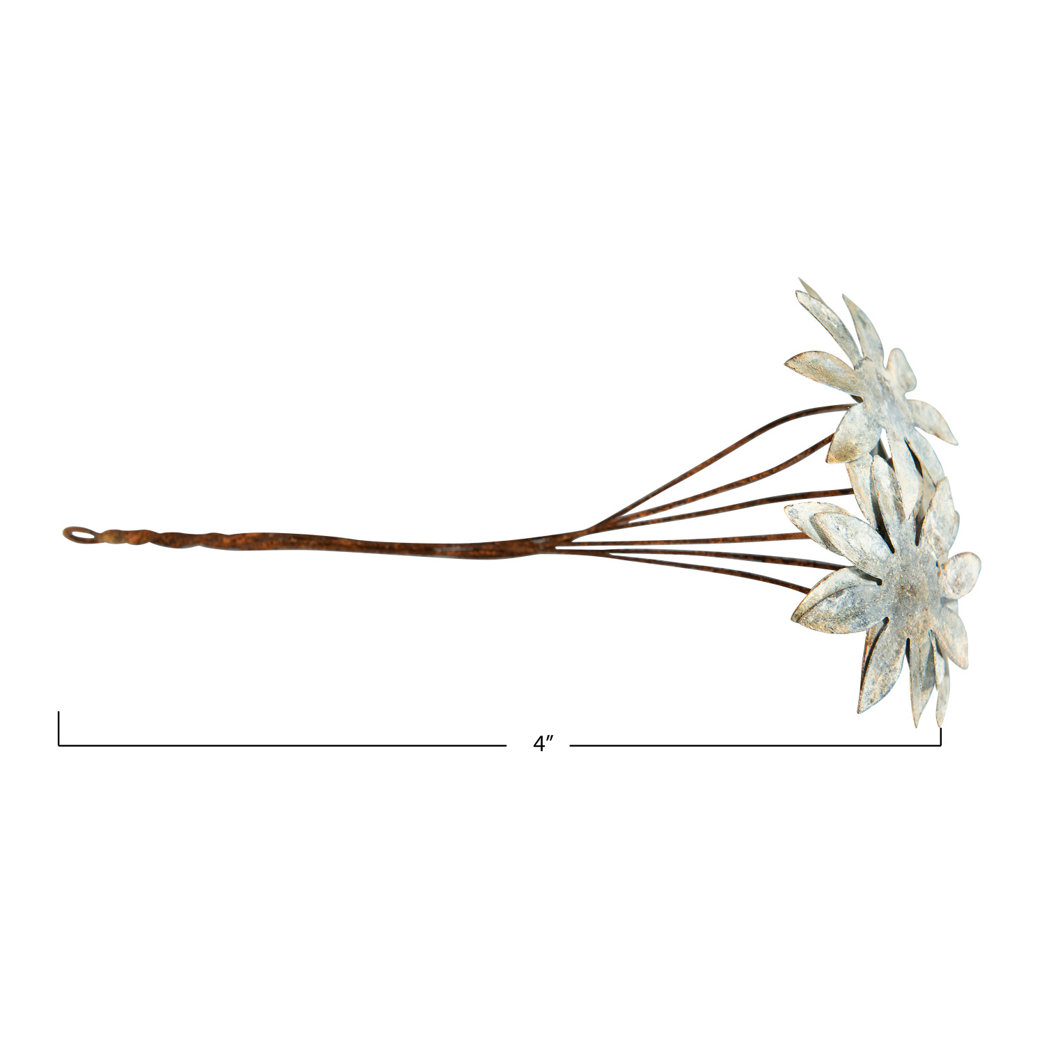 This distressed metal flower bunch has a variety of applications. It can be hung by the opening in the stem or laid flat on a table or in a decorative basket. For a centerpiece, place in a decorative vase with colorful sand holding the metal stem on the inside.