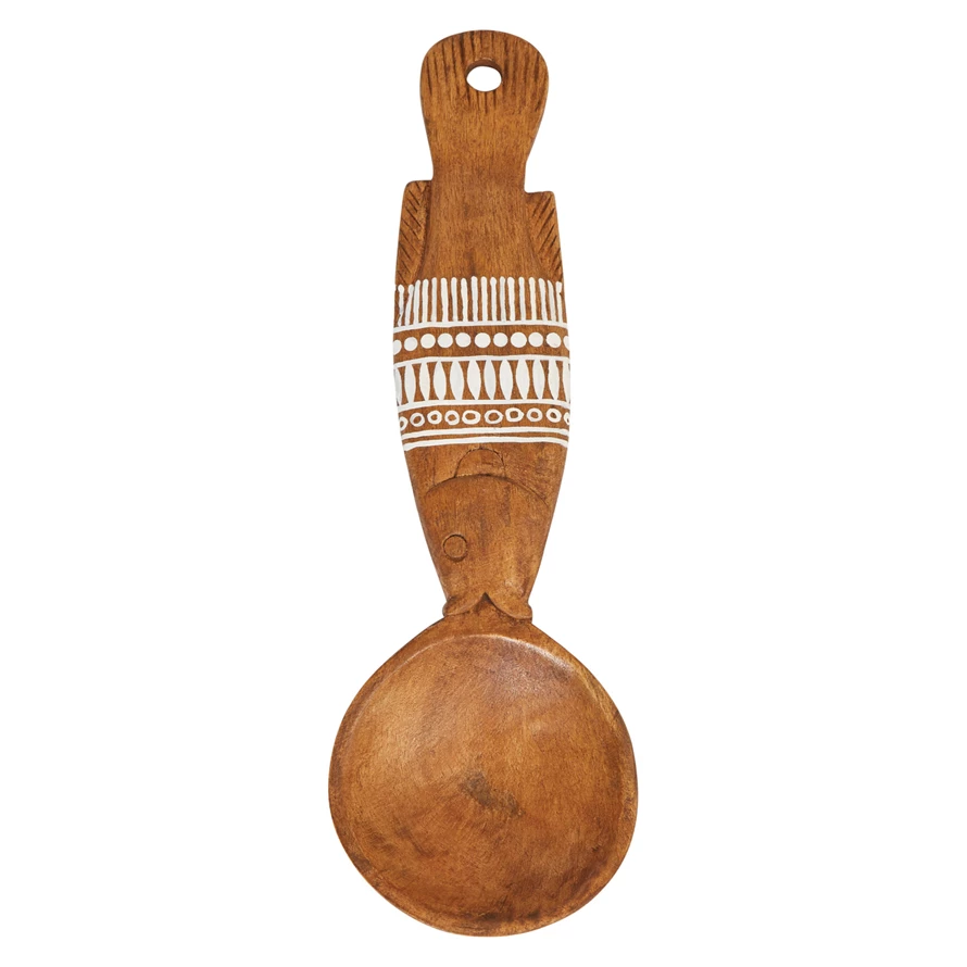 Catalog Name: 5-1/2"W x 18"H Decorative Mango Wood Fish Shaped Wall Hanging Spoon w/ Hand-Painted White Pattern, Natural