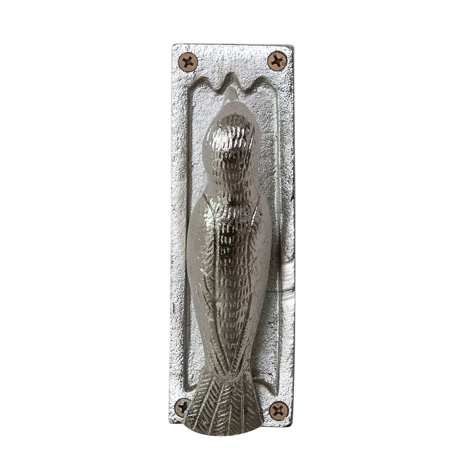 Catalog Name: 2"W x 2"D x 6"H Cast Iron Bird Shaped Door Knocker, Nickel Finish