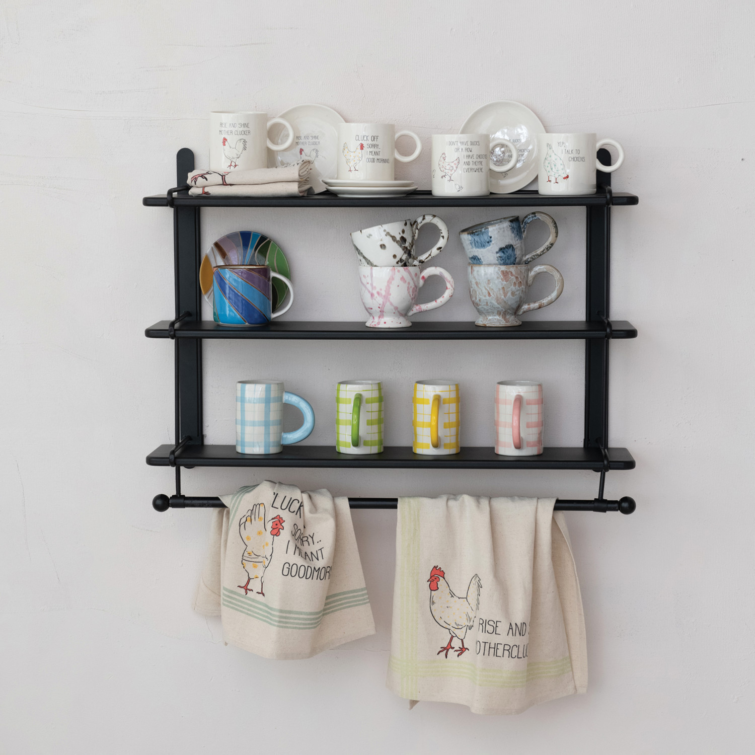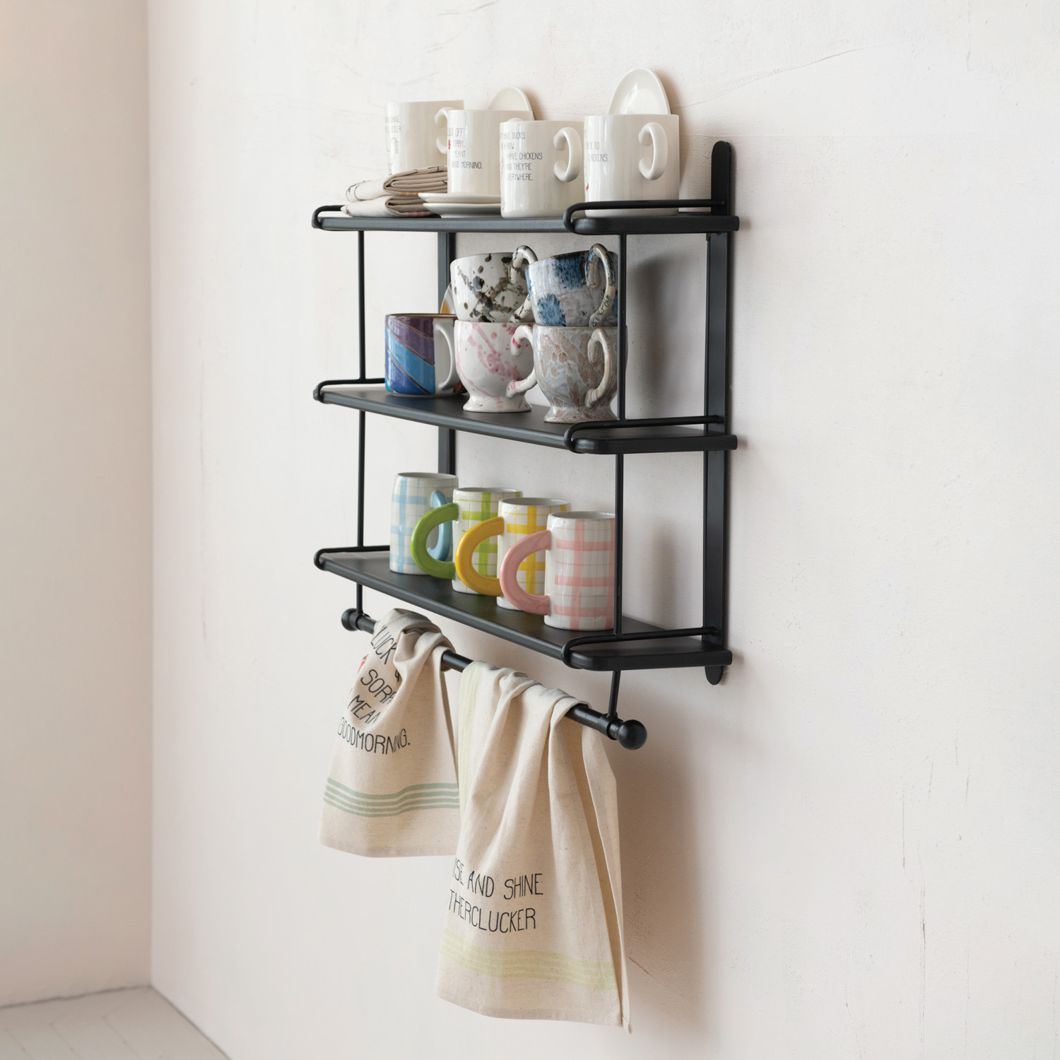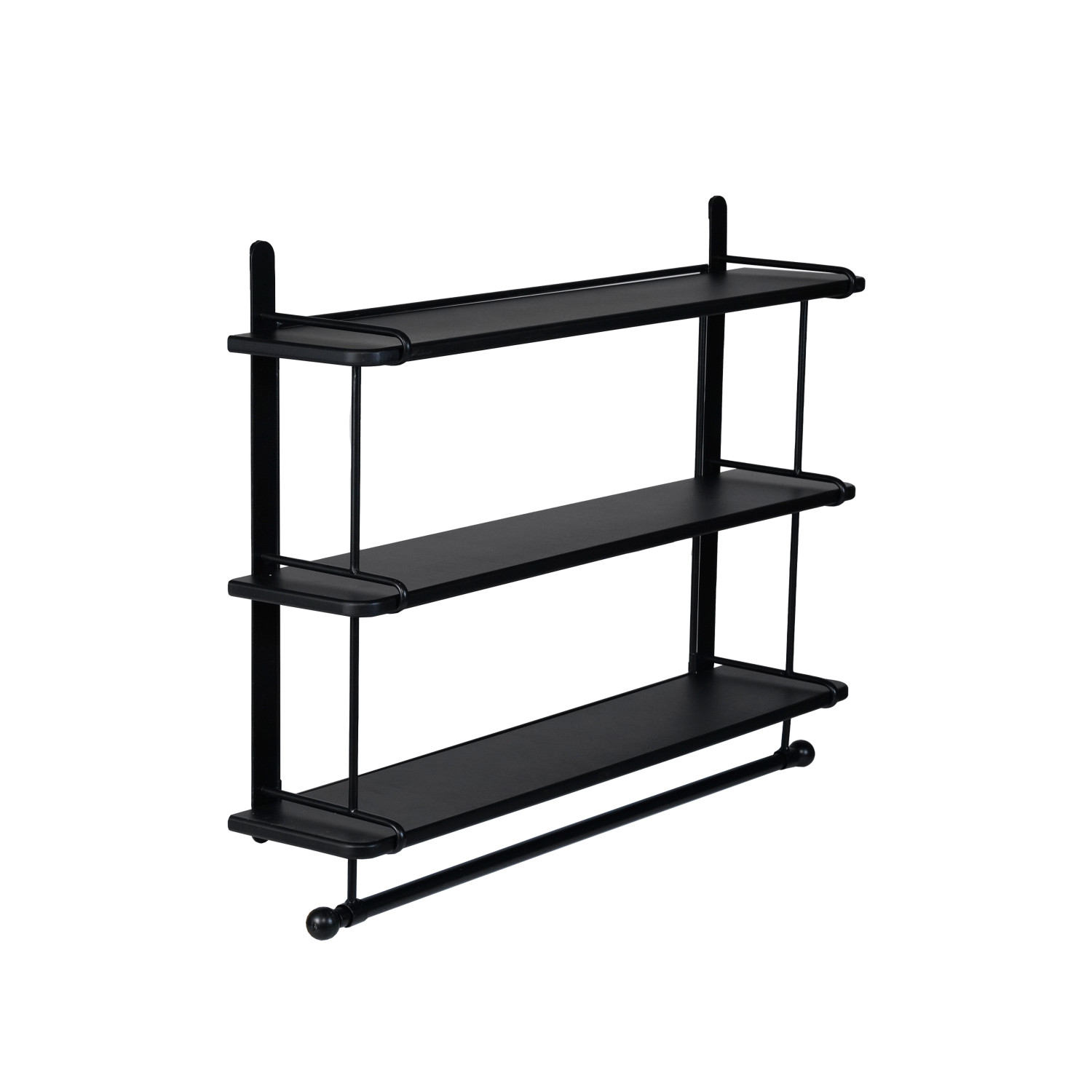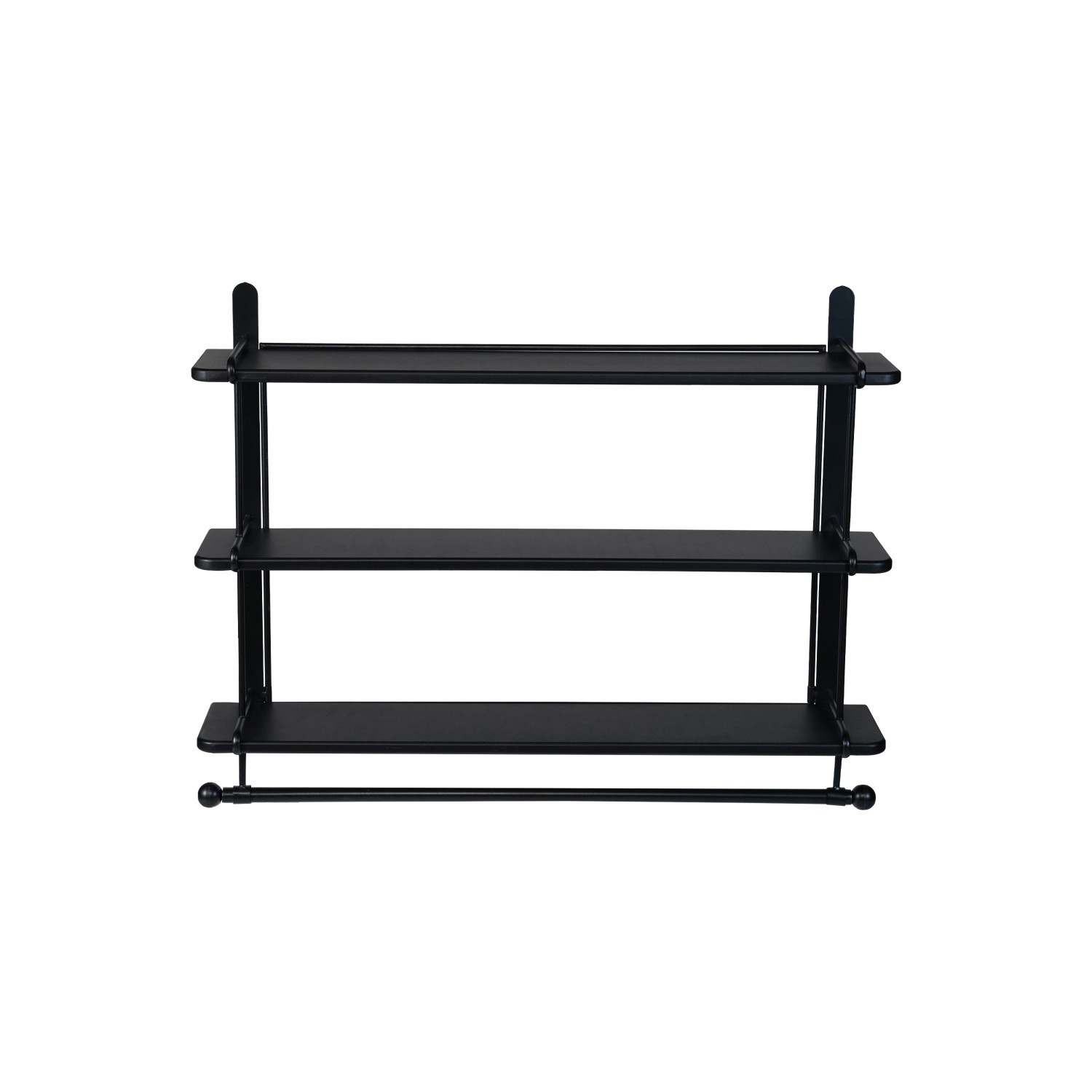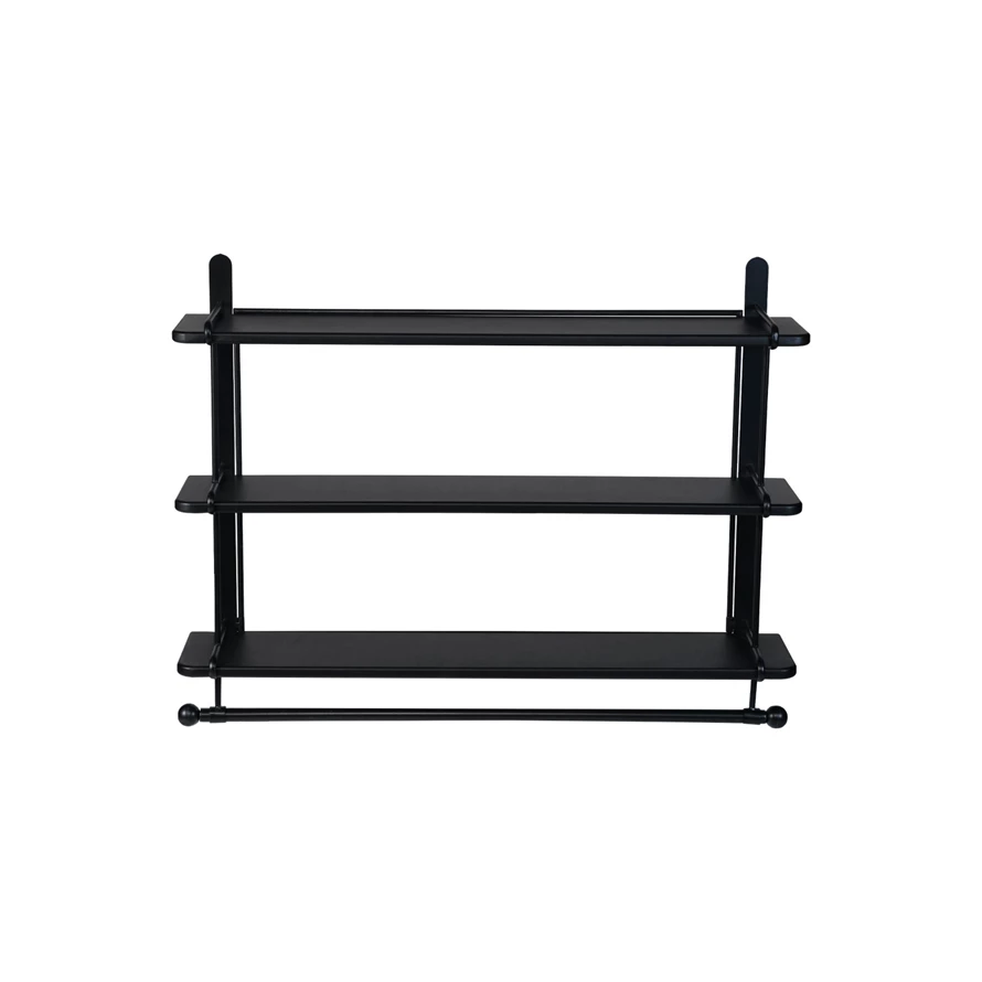 Wood & Metal Wall Shelf w/ 3 Shelves & Rod, Black, KD
