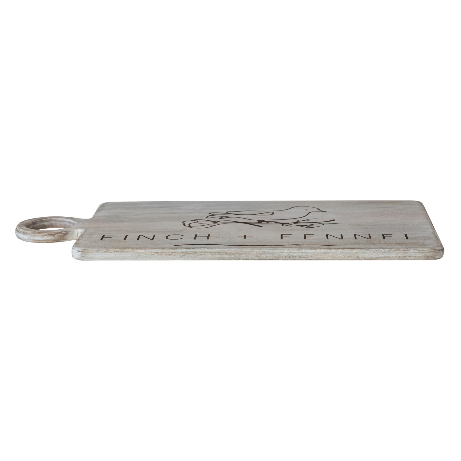 Catalog Name: 22"L x 10-1/2"W Mango Wood Sign Board w/ Laser Etched "Finch + Fennel" Logo & Handle, Whitewashed