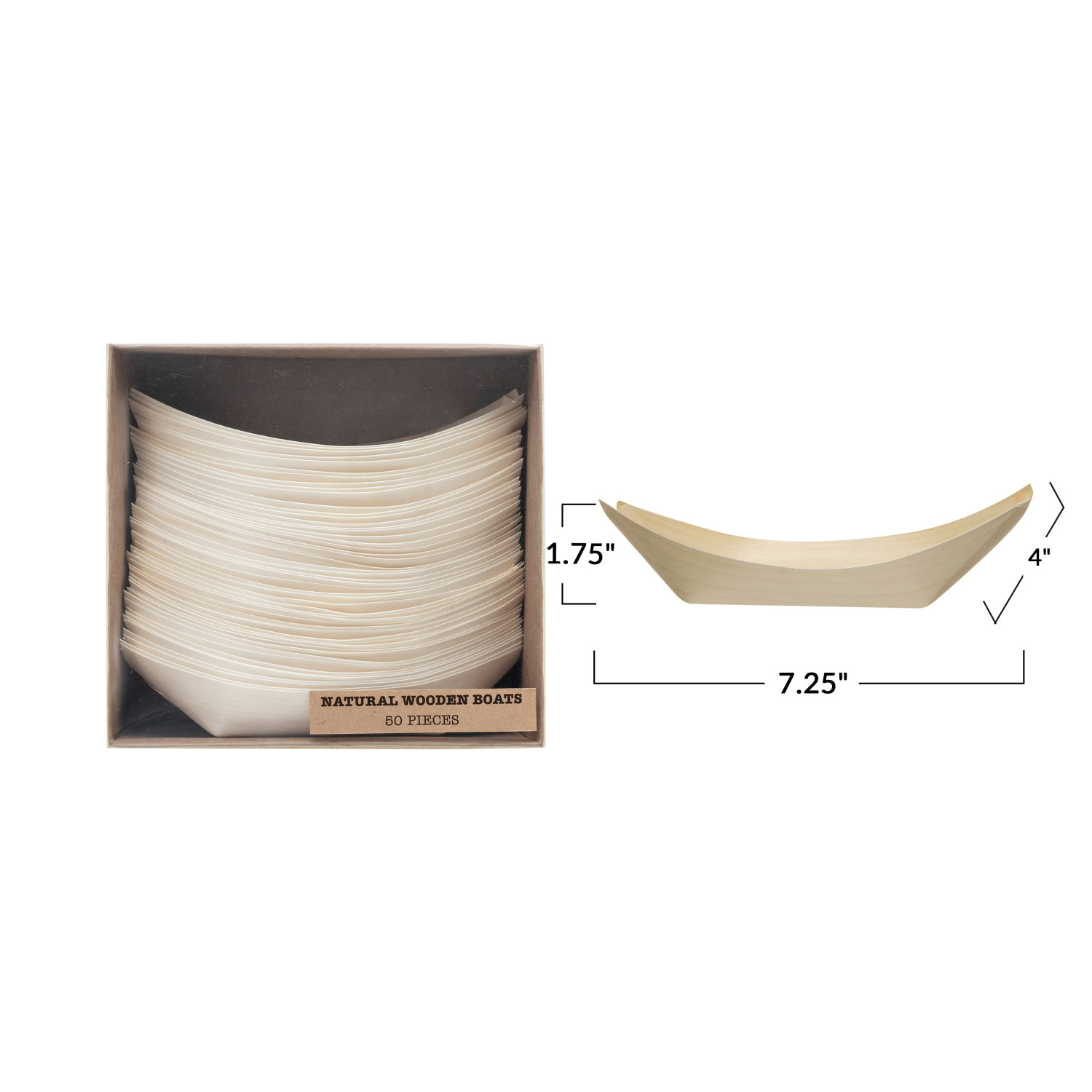 Catalog Name: 7-1/4"L x 4"W x 1-3/4"H Wood Single Use Snack Boats in Kraft Box, Natural, Set of 50