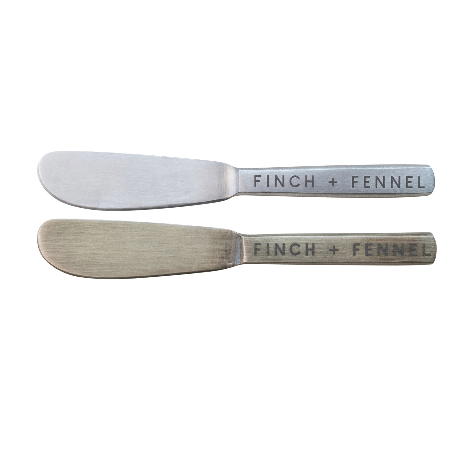Catalog Name: 6"L Stainless Steel Canape Knife w/ Laser Etched "Finch + Fennel", 2 Finishes