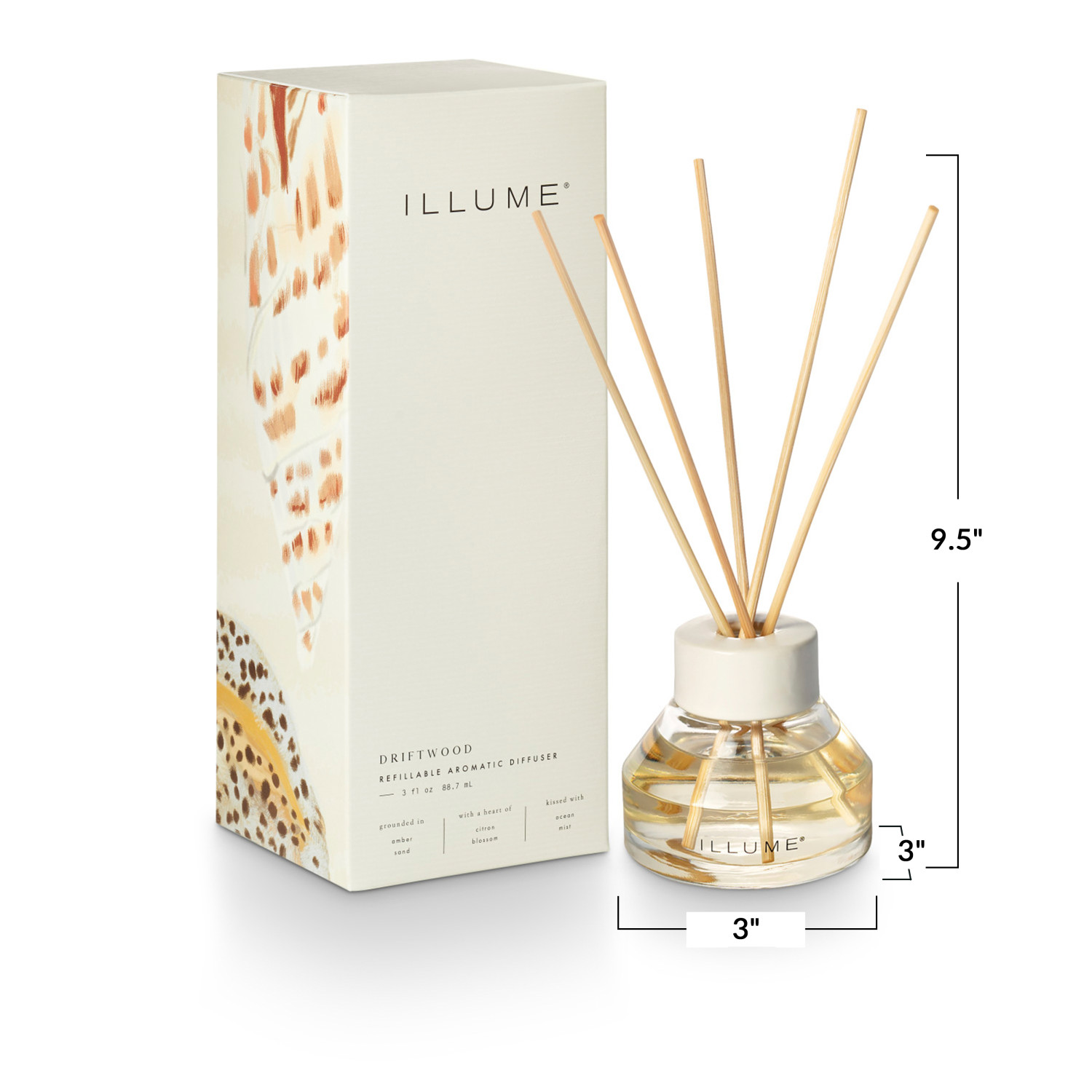 Beautifully Done Driftwood is grounded in amber sand with a heart of citron blossom kissed with ocean mist. With a modern shape and grounding white ceramic collar, this reed diffuser is refillable with our 6oz alcohol-free diffuser refill.