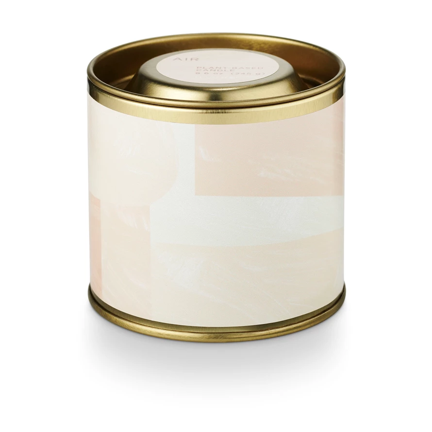 A painterly tin candle with organic shapes and movement, lidded in matte gold.