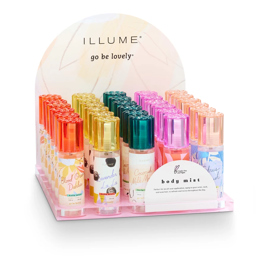 This stand-alone display for Go Be Lovely body mist products facilitates fragrance selection and impulse purchasing while complimenting any store's decor. Highly visible displays can increase featured products’ sales volume!